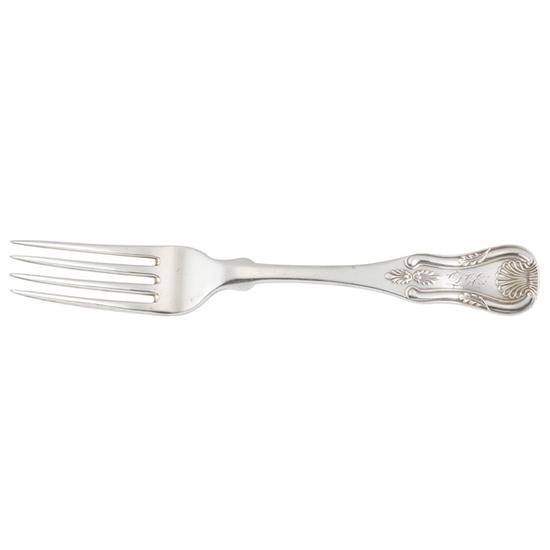 Fork with four tines and upturned handle struck with a King's pattern variant and shell pattern on the end. Inscription: Engraved on handle obverse: "DGE" in feathered script. Mark: On handle reverse: [eagle device] in conforming reserve and incuse "BALL, TOMPKINS & BLACK".