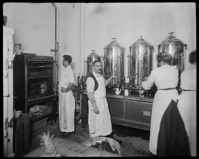 228 East 21st Street. House of Consolation, kitchen showing gas range, plate warmer with steam table, coffee and tea urns and hot table.