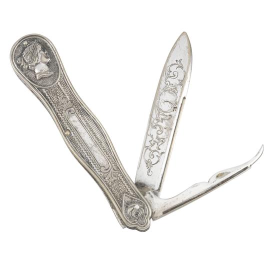 Fruit knife with two folding blades. handle decorated with raised medallion of a woman's profile at side, a rose at the hinge, and body of handle with engine-turned decoration leaving a blank cartouche on one side. Mark: unmarked.