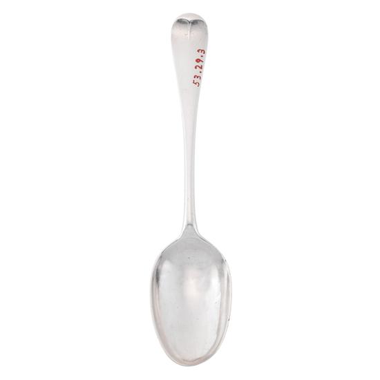 Soup spoon with upturned handle, short midrib, long oval bowl with shell, half-moon crescent bowl-back decoration, and single long drop. Inscription: Engraved on handle reverse: "N/H*S". Mark: Struck twice on handle reverse: "I [pellet] B" in oval.