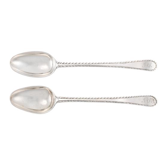 Dessert spoon with egg-shape bowl, single bowl-back drop, downturned, carved feather edge handle with round tip end, and back tipt. Inscription: Engraved on handle obverse: "J.A.L." in feathered script. Mark: Struck on handle reverse: "D.V" in rectangle.