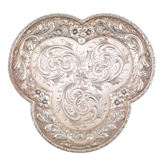 Trefoil-shaped pin tray with engraved scrollwork and floral designs on front of tray. The lip of the tray has repoussé floral designs. Mark: Marked on base of tray: Howard & Co. / Sterling 1887 / New York.