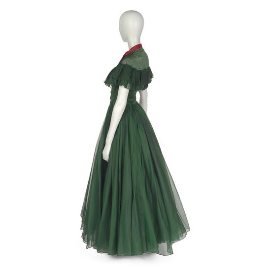 Evening ensemble in crimson, emerald green, violet, and coral red silk poult-de-soie, comprising blouse and skirt