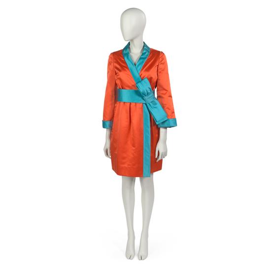 Evening ensemble with evening dress in American Beauty red satin and coat in pink marabou