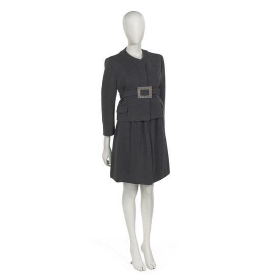 Ensemble in grey wool twill, comrpising dress, jacket, and belt