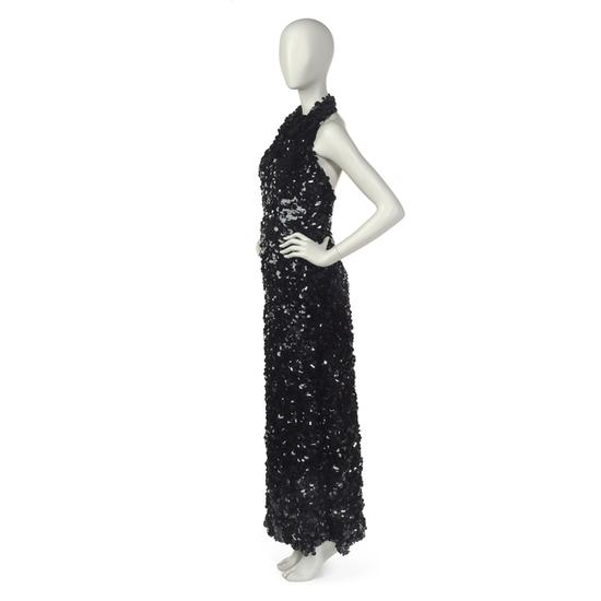 Evening dress in black silk with applied black beads and star-shaped paillettes in scallop pattern