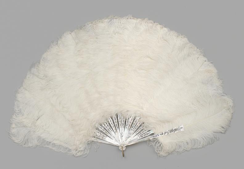 Folding feathered fan of shell pink ostrich and grey marabou feathers