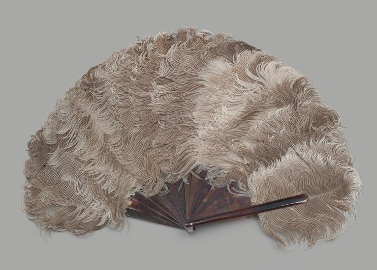 Folding feathered fan of clipped ostrich feathers