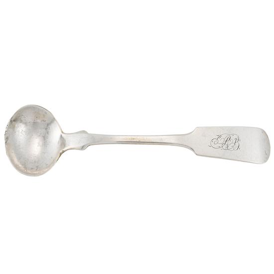 Salt spoon with downturned fiddle handle and oval bowl. Inscription: Engraved on handle obverse, in script: R B | Mark: Struck on handle reverse, in serrated rectangle: Wm Smith.