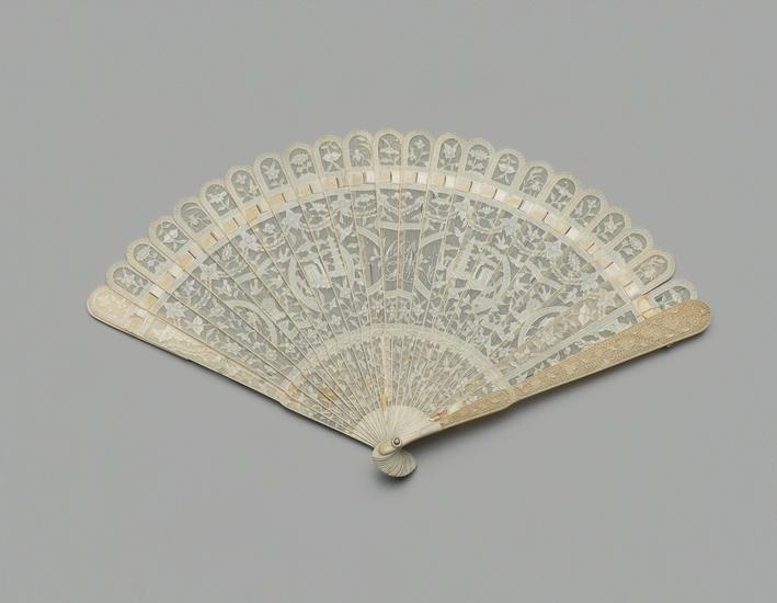 Brisé fan of pierced and carved ivory with original lacquer fan box