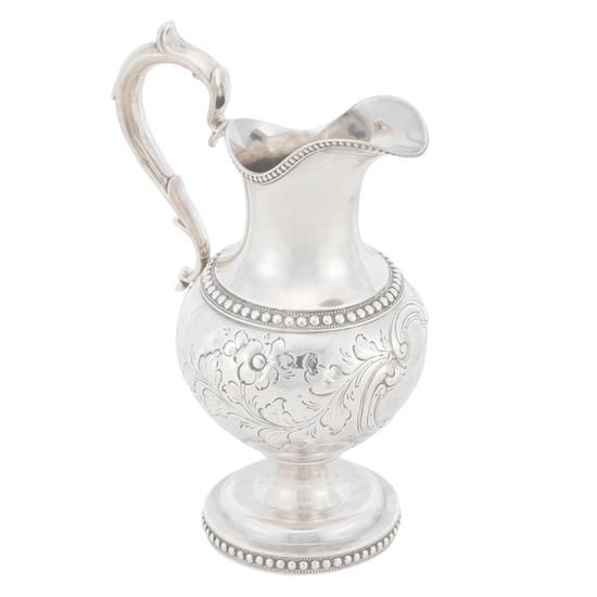 Pitcher with inverted pyriform with narrow tubular neck and stepped circular foot, scroll handle, and body repoussé-chased with floral motif. Inscription: Engraved in reserve on body in old English caps: SFH. Mark: Struck on underside of base in serrated rectangles: W. ADAMS / NEW-YORK.