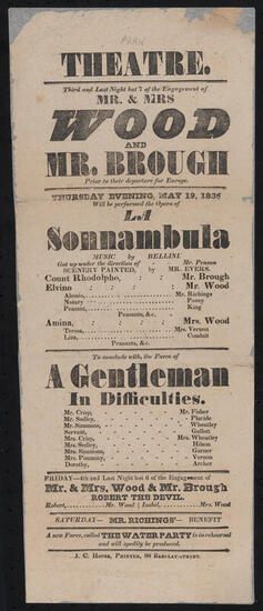 Last night but three of the farewell engagement of Mr. & Mrs. Wood. "Robert the Devil; or, The Mystic Branch" on Thursday evening, May 22, 1834