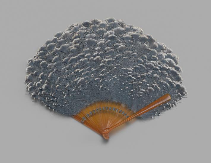 Folding feathered fan of shell pink ostrich and grey marabou feathers