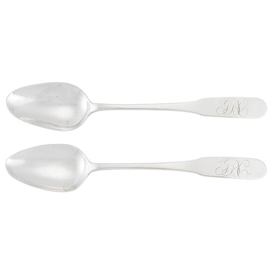 Teaspoon with egg-shaped bowl, V-shaped bowl back drop, and downturned finless fiddle handle with back tipt. Inscription: Engraved on handle: JBC. | Mark: Struck on handle reverse: G.FORBES