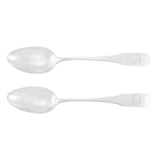 One of a pair of tablespoons with egg-shaped bowl, molded single drop, downturned finless fiddle handle, and back tipt. Inscription: Engraved on handle: JBC. | Mark: Struck on handle reverse: G.FORBES