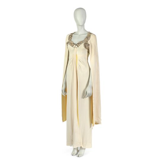 Evening ensemble in Indian sari silk comprising gown and bolero
