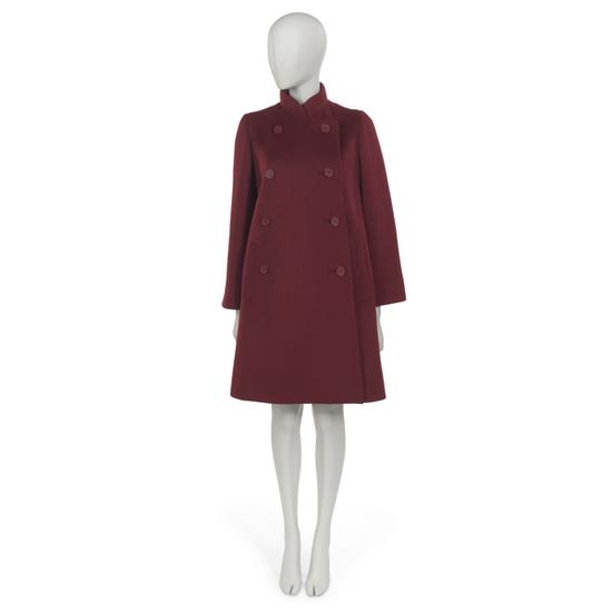 Ensemble comprising brown alpaca coat and off-white worsted jersey dress