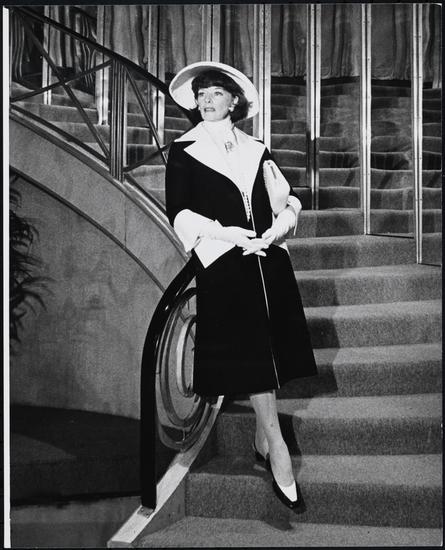 [Katharine Hepburn as Coco Chanel with ensemble in "Coco".]