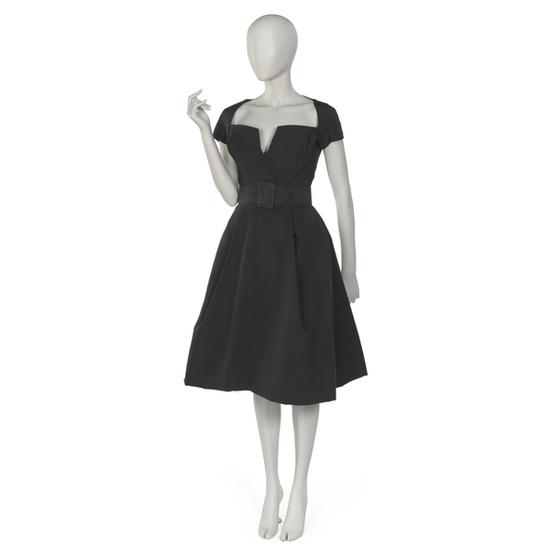 Cocktail dress in black slubbed silk printed in pink, white and green rose pattern