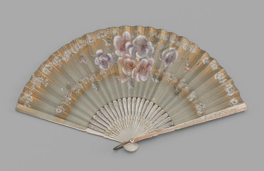 Folding fan of painted, gilded, and embroidered black silk leaf