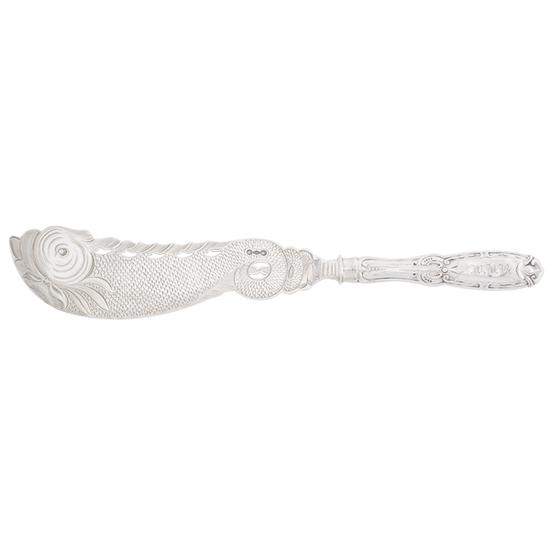 Fish knife with silver blade in the shape of an imaginary fish, pierced at upper edge below engraved waves continuing to filled silver handle die-struck in "Jenny Lind" pattern on both sides. Handle design is "Jenny Lind" pattern originated by Albert Coles.