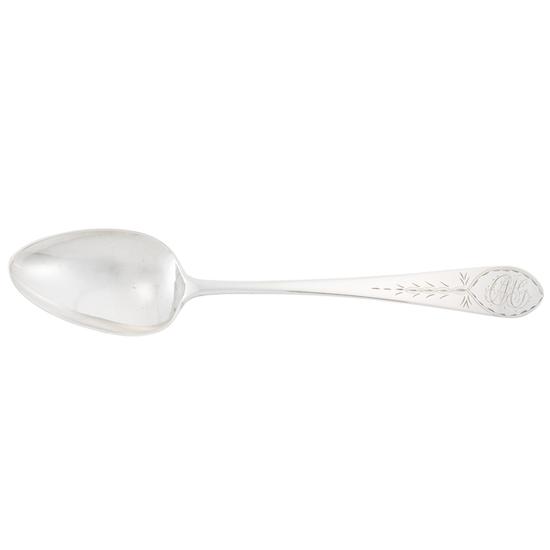 Tablespoon with pointed oval bowl, pointed drop on back, and bright-cut design on handle tip. Inscription: Engraved on handle obverse: CMG Mark: Struck on handle reverse: BW / N.YORK