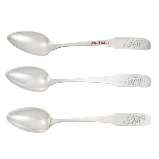 One of a set of three teaspoons with pointed rounded-arch, raised drop on bowl, and downturned, back tipt, coffin handle. Inscription: Engraved on handle obverse, in script: A D W Mark: Struck on handle reverse: I.W. FORBES