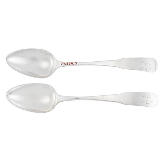 One of a pair of tablespoons with egg-shaped bowl, long drop on back, and downturned, finless, back tipt, fiddle handle. Inscription: Engraved on handle obverse in feathered script: L. Mark: Struck on handle reverse: H. WISHART