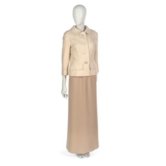 Evening ensemble comprising dress and fur-trimmed jacket
