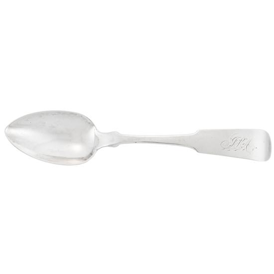Spoon with downturned, back tipt, fiddle handle with rounded shoulders continuing to egg-shaped bowl with bowl-back shell. Inscription: Script initials on handle obverse: JSA Mark: Marked on handle reverse in rectangle: E.T. Pell