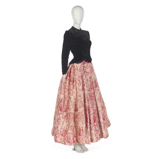 Hostess ensemble comprising ivory silk taffeta dress and black velvet cutaway coat