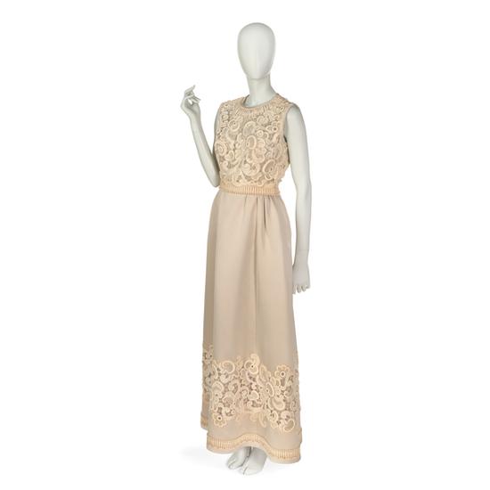 Evening dress in pale pink satin and cream satin brocade with applied maple leaves