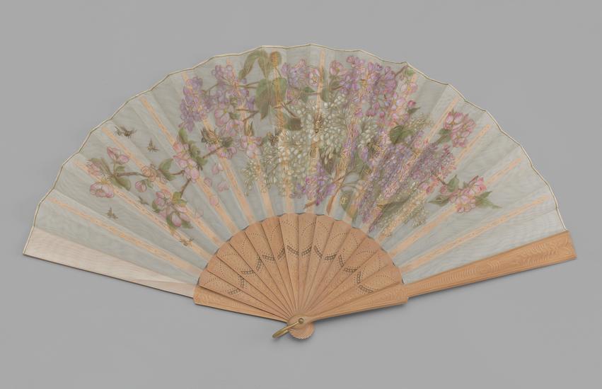 Folding fan of tan silk with painted spray of chrysanthemeums