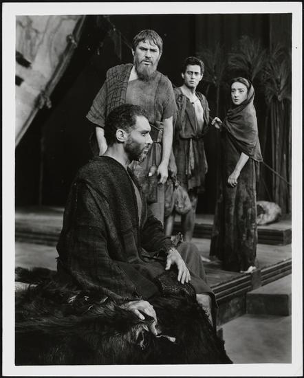 [Anthony Quayle as Moses, Torin Thatcher as Seti the Second and Katharine Cornell as Anath Bithiah in "The Firstborn".]