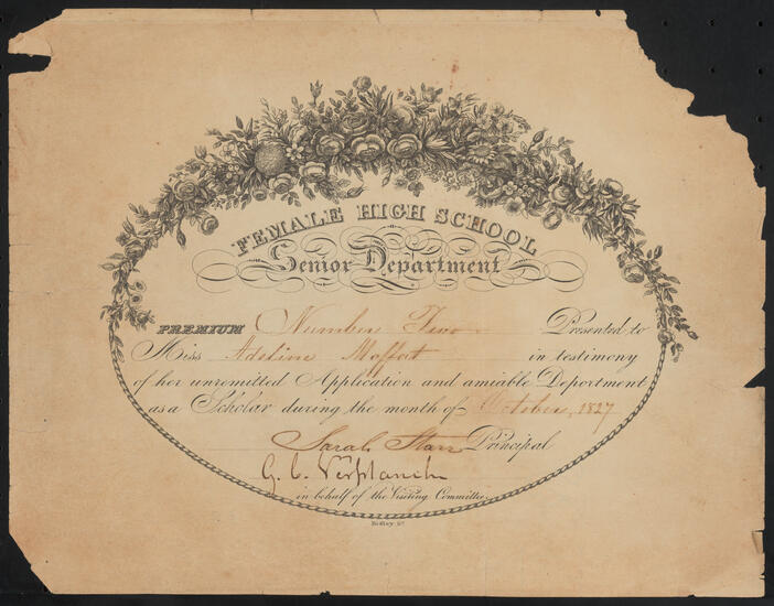 [Testimonial to punctuality, deportment and diligent attention to study.]