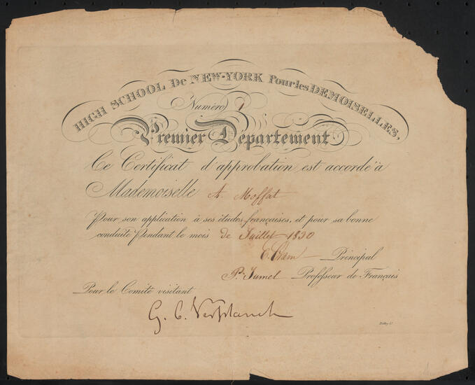 [Testimonial to punctuality, deportment and diligent attention to study.]