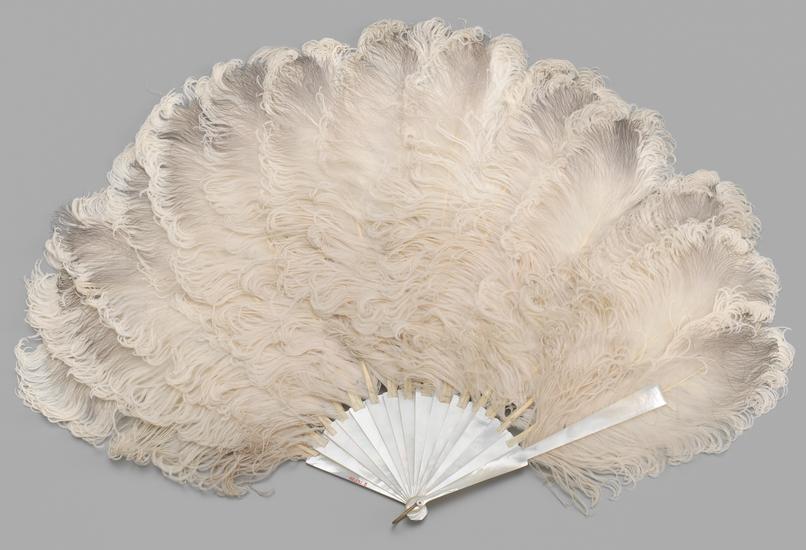 Folding feathered fan of yellow ostrich feathers tipped with birds' heads