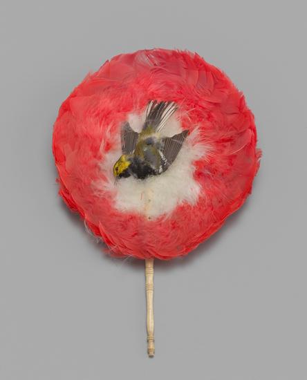 Fixed feather fan of white marabou with taxidermied goldfinch