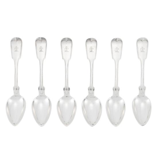 One of a set of twelve teaspoons with upturned handle, double die-struck in fiddle-thread pattern, rounded shoulders, pointed egg-shaped bowl, and engraved with the Maitland family crest on handle obverse. Inscription: Engraved on handle obverse with Maitland crest: [lion affronte, in dexter gamb a sword (or dagger), in sinister gamb a fleur-de-lis] Mark: Struck on handle reverse, incuse: TIFFANY & CO. STERLING