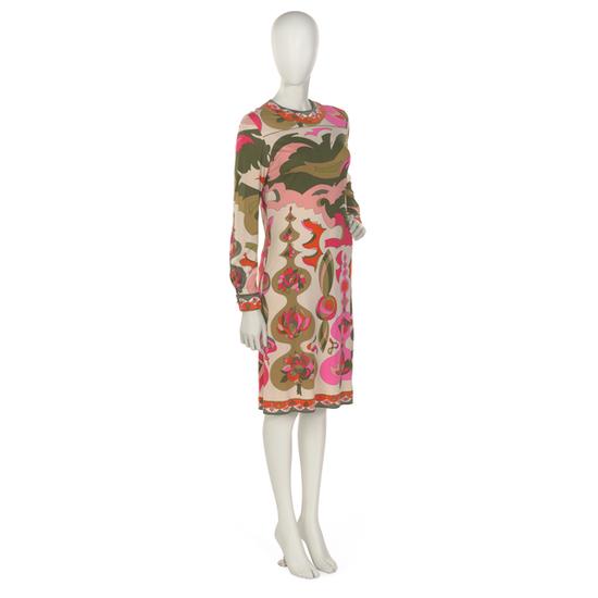 Dress in turquoise, pink, yellow, green and black printed Qiana jersey