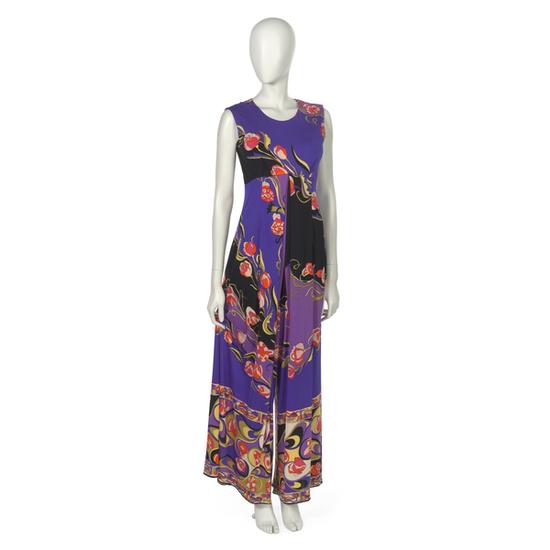 Evening jumpsuit of "Panung" silk knit jersey in light blue, tuquoise, fuschia, white, and shades of purple