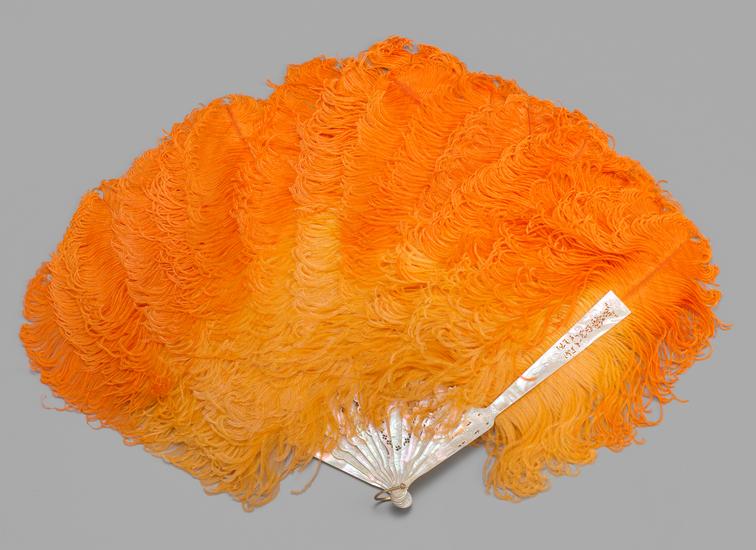 Folding feathered fan of shell pink ostrich and grey marabou feathers