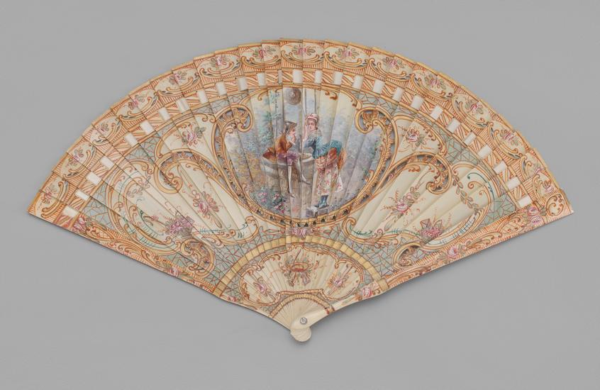 Brisé ivory fan with lacquered painted scenes depicting urban canal and river scene