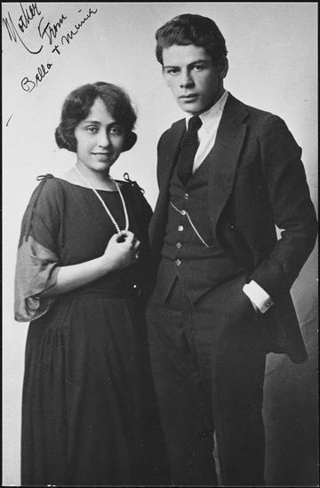 [Paul Muni with his wife, Bella Finkle, and dog.]