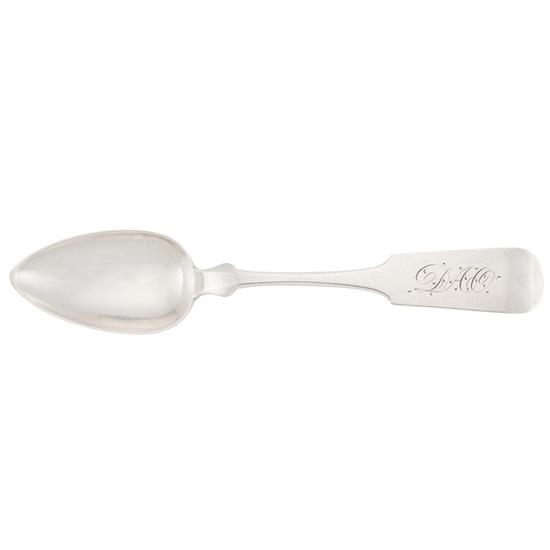Dessert spoon with rounded, downturned, back tipt fiddle handle with rounded shoulders and egg-shaped bowl with incised single bowl-back drop. Inscription: Engraved on handle obverse in script: DAO. Mark: Struck on handle reverse: AKERLY & BRIGGS [profile male head] [lion passant] C