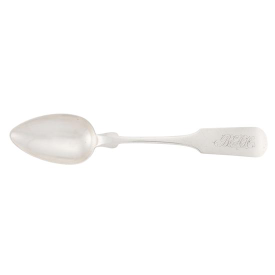 Dessert spoon with rounded downturned, back tipt, fiddle handle, rounded shoulders, incised rounded bowl-back drop, and egg-shaped bowl. Inscription: Engraved on handle obverse in script: BEAH. Mark: On handle reverse in serrated rectangle: TAYLOR & CO.