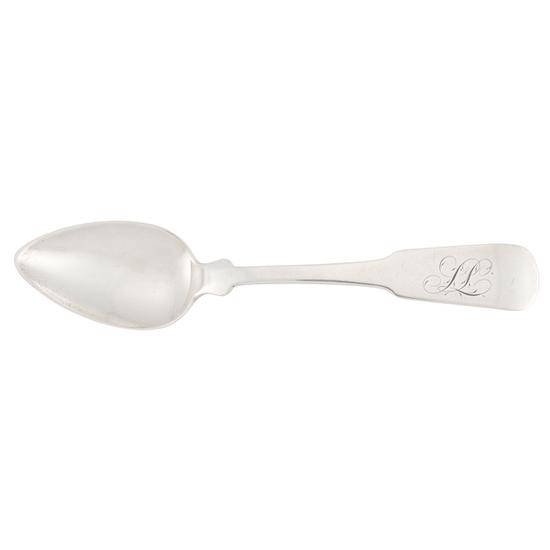Teaspoon with rounded, downturned back tipt, fiddle handle, rounded shoulders, egg-shaped bowl, and incised bowl-back drop. Inscription: Engraved on handle obverse in script: SL. Mark: On handle reverse: G.EOFF / C.