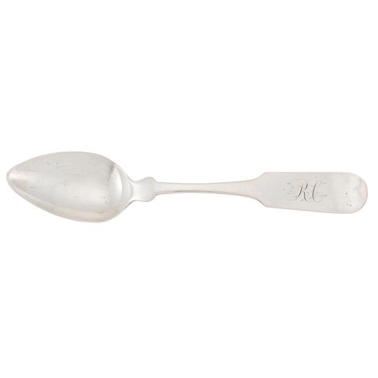 Teaspoon with rounded, upturned, front tipt fiddle handle, rounded shoulders, and egg-shaped bowl. Inscription: Engraved on handle obverse in script: RC. Mark: Incuse mark on handle shank: AKERLY & Co. /[thistle or profile head] / [letter C] / [leopard's head] / [lion passant].