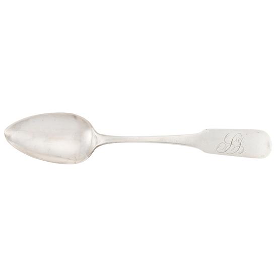 Teaspoon with downturned back-tipt finless fiddle handle, incised bowl back drop, and egg-shaped bowl. Inscription: Engraved on handle obverse in script: SJ Mark: On handle reverse in serrated rectangle: S. Brown.