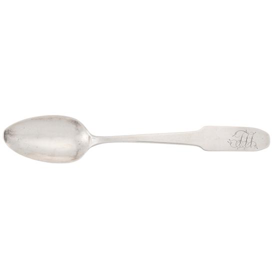 Teaspoon with downturned, finless back tipt coffin handle with long oval bowl and molded back drop. Inscription: Engraved on handle obverse in script: SST. Mark: On handle reverse: I.W.Forbes / [anchor] / [star]